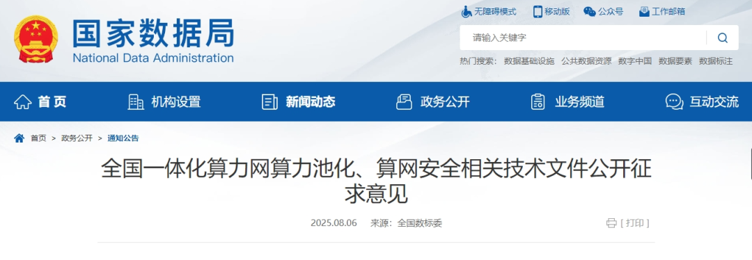 消息来源:国家数据局 全国一体化算力网算力池化、算网安全相关技术文件公开征求意见