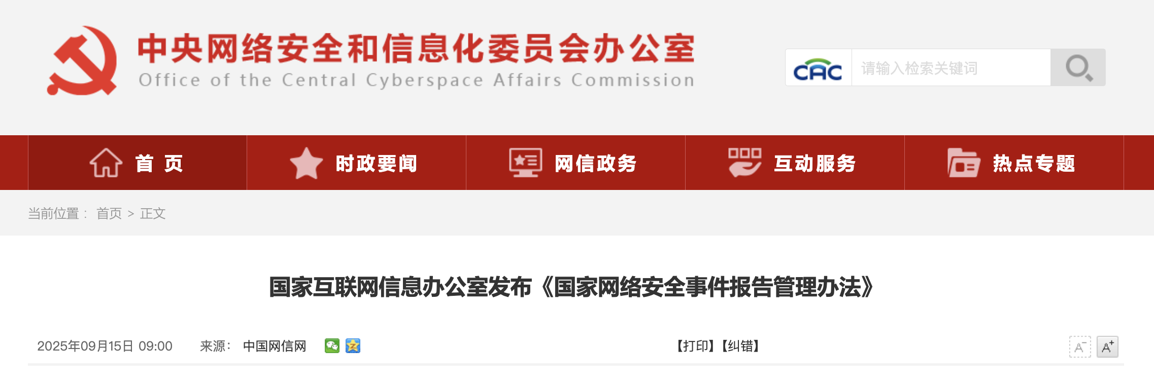 国家互联网信息办公室发布《国家网络安全事件报告管理办法》 |