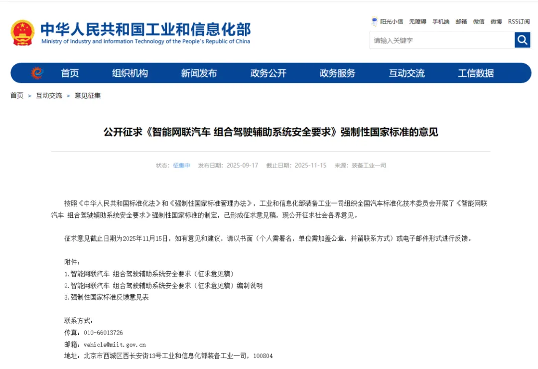 9月17日,工业和信息化部正式就《智能网联汽车 组合驾驶辅助系统安全要求》强制性国家标准公开征求意见。征求意见截止日期为2025年11月15日。该标准与UN R171《关于批准车辆驾驶员控制辅助系统(DCAS)统一规定》等国际标准规协调接轨,并紧密结合中国复杂道路交通场景,充分考虑了本土实际道路交通环境以及系统的实际安全需要。