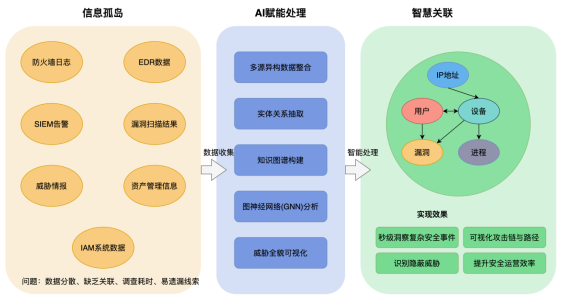 AI赋能安全事件分析 AI可以赋能智能安全事件分析与调查能力。包括一是AI驱动的告警降噪与智能分类,AI自动过滤重复、已知误报,并根据告警特征和上下文智能分类、分配优先级。二是具备智能事件关联与攻击链可视化能力,AI利用图分析技术,将来自不同系统、不同时间的告警片段关联起来,自动构建完整攻击链图谱,清晰展示攻击全貌。三是进行AI辅助调查与上下文丰富,AI辅助调查助手自动拉取相关资产信息、威胁情报和历史记录,提供决策建议,并能生成事件摘要报告。 AI赋能安全事件分析使企业告别海量告警,显著缩短平均事件调查时间(MTTI)50%以上,甚至从数小时降低到数分钟。通过快速理解事件全貌,安全团队能够更精准、高效地识别和响应关键威胁,避免威胁扩散,最大化遏制攻击影响,显著提升安全运营效率,从而提升企业的整体安全响应能力。 场景七:安全知识图谱 - 洞察威胁全貌企业的网络安全运营面临海量且高度碎片化的安全数据。这些数据来源于不同的安全设备(如防火墙、EDR、SIEM、漏洞扫描工具、威胁情报平台以及资产管理系统)。由于缺乏有效的关联和统一的视图,安全分析师在调查复杂安全事件时,必须耗费大量时间从不同系统中手动收集、整理和关联信息,不仅效率低下,而且极易出错或遗漏关键线索。这种信息孤岛现象导致分析师难以快速理解事件的深层逻辑、攻击者的真实意图以及威胁的演变路径,从而阻碍了高效的威胁溯源和决策。