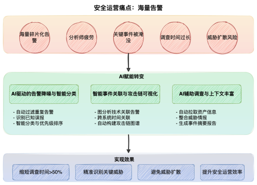 AI赋能情报分析 AI可以赋能情报的深度分析与结构化能力。包括一是自动化情报聚合与标准化,AI利用自然语言处理(NLP)技术,自动从多源威胁情报(如商业情报、开源情报、漏洞库CVE/NVD)中高效采集、清洗、抽取并标准化情报信息。二是具备非结构化文本深度理解能力,AI(特别是大型语言模型LLMs)能够对海量的安全报告、漏洞描述、新闻文章等进行语义理解,自动识别和提取关键实体(如恶意IP、域名、文件哈希)、攻击技术(TTPs)、威胁行为者(APT组织)及其关联关系。三是AI还能进行情报富化与知识图谱构建,AI将提取出的情报信息与企业内部资产、漏洞、用户行为等数据进行交叉关联,构建安全知识图谱,从而为情报提供更丰富的上下文,并揭示潜在威胁。 AI赋能情报分析使企业实现从被动接收情报到高效提炼洞察的转变,大幅提升威胁情报的利用效率。通过将非结构化情报转化为结构化、可查询的知识,使安全团队更快速地理解新型攻击手法和威胁趋势。通过自动化处理情报,使安全分析师能够将更多精力投入到情报的深度应用和防御策略的制定中,有效弥补了情报分析方面的人力短缺。 场景六:智能安全事件分析 - 实现秒级洞察安全运营中心(SOC)在安全事件发生时,常被海量、碎片化、低价值告警淹没,人工分析师需要花费大量时间进行去重、分类、关联和上下文补充,才能判断事件的真实性和危害。这种海量告警导致分析师疲劳,关键事件被淹没,平均调查时间(MTTI)过长,错失最佳响应时机,导致威胁容易扩散并造成更大的损失。