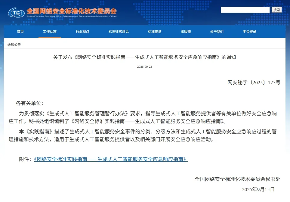 消息来源:全国网络安全标准化技术委员会 https://www.tc260.org.cn/front/postDetail.html?id=20250909095834