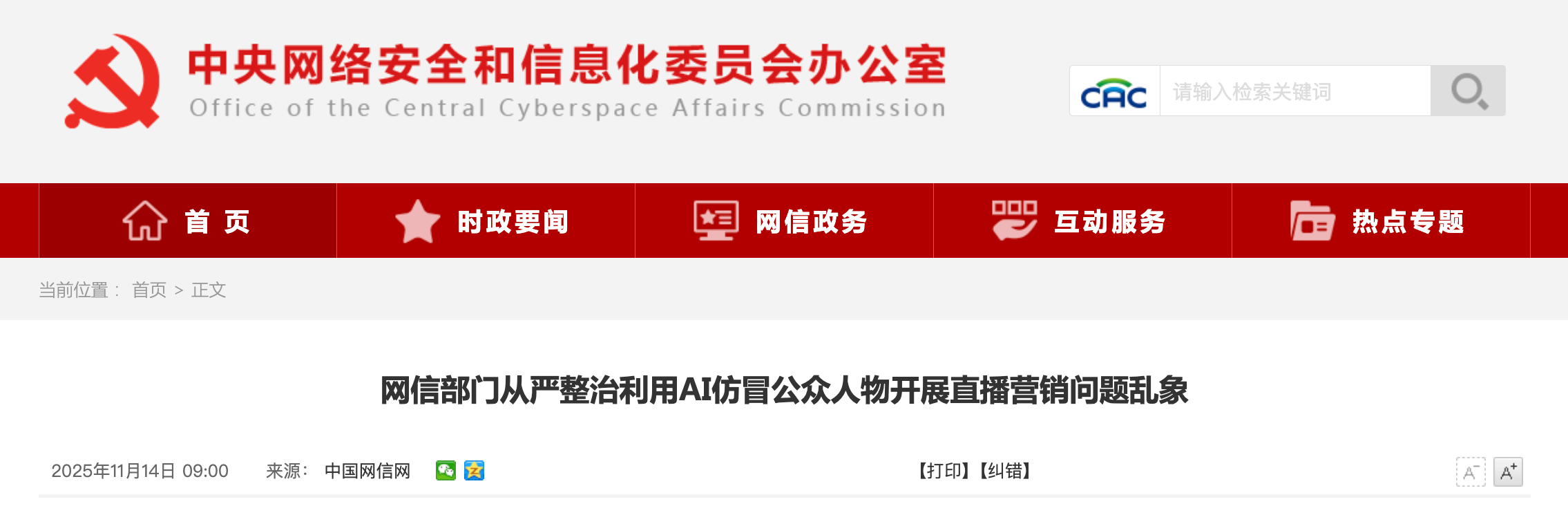 信息来源:中央网络安全和信息化委员办公室 https://www.cac.gov.cn/2025-11/14/c_1764843588402006.htm
