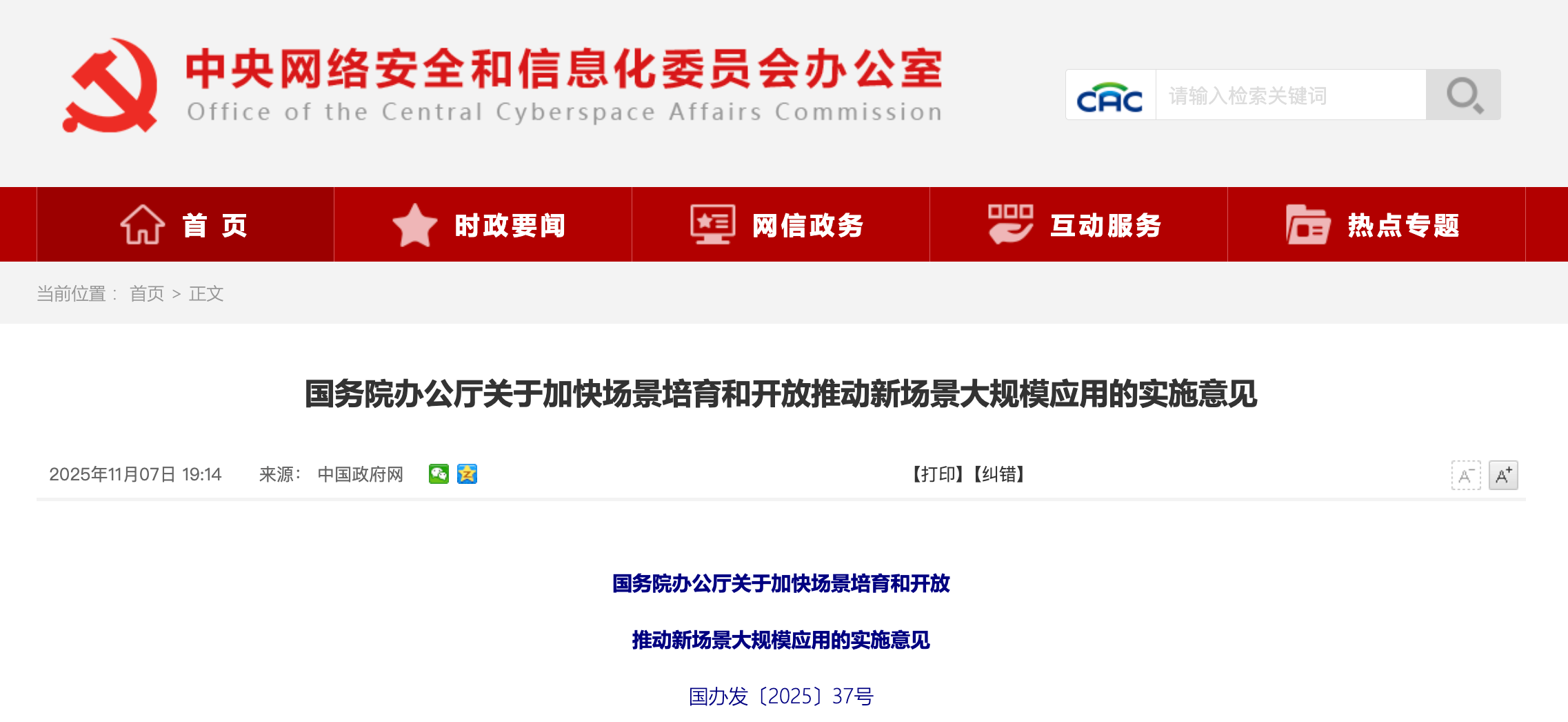 各省、自治区、直辖市人民政府,国务院各部委、各直属机构: 场景是用于系统性验证新技术、新产品、新业态产业化应用以及配套基础设施、商业模式、制度政策的具体情境,是连接技术和产业、打通研发和市场的桥梁,是推动科技创新和产业创新融合发展的重要载体,对促进新技术新产品规模化商业化应用具有重要牵引作用。为加快场景培育和开放,推动新场景大规模应用,经国务院同意,现提出以下意见。 一、总体要求 以习近平新时代中国特色社会主义思想为指导,深入贯彻党的二十大和二十届历次全会精神,完整准确全面贯彻新发展理念,坚持创新引领、改革推动、因地制宜、安全有序、系统推进、融合发展,充分发挥我国超大规模市场和丰富应用场景优势,支持建设一批综合性重大场景、行业领域集成式场景、高价值小切口场景,扩大生产场景、工作场景、生活场景供给,推动场景资源开放,促进场景资源公平高效配置,推动新场景大规模应用,形成“技术突破—场景验证—产业应用—体系升级”的路径,为加快培育发展新质生产力、推动经济社会高质量发展提供有力支撑。 二、加快培育拓展经济社会应用场景 (一)打造一批新领域新赛道应用场景 数字经济领域。深入挖掘数据要素潜能,支持数据分析挖掘、流通使用、安全防护等领域技术创新,丰富数据产品和服务供给,在办公、社交、消费、娱乐等领域探索应用元宇宙、虚拟现实、智能算力、机器人等技术创新应用场景,推动实体经济和数字经济深度融合。 人工智能领域。加强关键核心技术攻关和推广应用,加快高价值应用场景培育和开放,更好满足科技、产业、消费、民生、治理、全球合作等各领域发展需要。 全空间无人体系。推动海陆空全空间无人体系应用和标准建设,鼓励打造涵盖全空间的文旅、政务、物流、卫星服务等应用场景,拓展工业生产、城市规划建设治理、综合立体交通、公共服务、安全防护、农业生产等无人体系应用场景。稳妥有序拓展低空经济等领域应用场景。 生物技术领域。推动生物技术广泛应用于新材料、建筑、能源、环保等产业创新场景,重点开放生物基材料替代、生物能源低碳转化、天然产物绿色制备等应用场景,构建生物技术产业融合发展生态圈。 清洁能源领域。推动清洁能源在铁路、公交、环卫、重卡、农机、物流等领域开放应用,建设清洁能源车辆运输走廊,同步布局能源供给站点,打造清洁能源全产业链协同发展应用场景。推动能源行业清洁低碳转型。创新数字化智能化能源生产运行管理、智能电网、绿电直供、虚拟电厂、车网互动等一批应用场景,推进绿色能源国际标准和认证机制建设。 海洋开发领域。推动深海探测、深海开采、深远海养殖、海洋工程装备、海洋电子信息、海洋生物医药等场景培育和开放,打造一批深海科技创新策源地。 (二)建设一批产业转型升级的新业态应用场景 制造业领域。聚焦智能制造、绿色制造、服务型制造、工业生物、工业智能等核心技术应用,创新柔性生产线、智能工厂、绿色工厂、高标准数字园区、零碳园区等应用场景,支持重点制造业企业向自主基础软件、工业软件等产品开放应用场景,遴选培育工业领域垂直大模型典型应用场景。鼓励地方和企业培育工业设计、中试验证、检验检测等生产性服务业应用场景。 交通运输领域。推动新技术应用,创新智能交通管理、车联网、智能调度等应用场景,优化城市交通结构,开拓国际航班空运过境货物转运应用场景,强化城市货运中转功能,在保证安全前提下提升运输效率。 智慧物流领域。加快智慧公路、智慧港航、智慧物流枢纽、智慧物流园区等发展。探索与新技术、新业态相结合的物流新模式和公铁、水水、铁水智慧联运新场景。加强仓配运智能一体化、数字孪生等技术应用,创新无人运输、无人装卸、无人配送、智慧仓储等应用场景。 现代农业领域。加快种业应用场景建设,加强设计育种、生物育种等科学技术支撑引领,推出育种、制繁种、扩繁等一批数字化应用场景,提升动植物育种水平。支持建设旱区、寒区、高原、盐碱地等特色种业应用场景。推出智慧农(牧、渔)场等一批智慧农业应用场景,创新种业、种养殖、食品加工全产业链应用场景,围绕饲料、养殖、流通、供应链金融等领域推动畜牧业、渔业数字化转型赋能。 (三)推出一批行业领域应用场景 应急管理领域。聚焦应急救援体系数字化场景,加强智能感知、无人救援、航空救援等技术和装备创新应用,提升灾害智能监测预警、应急指挥通信、抢险救援、应急物资供应能力。 矿山安全领域。集成云计算、工业互联网、无人驾驶等技术,实现智能感知、智能决策、自动执行、综合管控,提升矿山安全生产全流程自动化水平,构建生产条件实时感知、过程可视可控、风险可测可防、要素可调可配的高水平矿山安全生产智能化应用场景。 智慧水利领域。推动“天空地水工”一体化监测感知、水网工程建设管理、江河湖库巡查等应用场景开放,提升流域智能防洪、水网智能调度、河湖库立体空间智能监管、水利工程智能运管等能力。 施工安全领域。集成智能风险预警、无人设备自主巡检、高危作业替代、智能监控等技术,构建智慧工地、施工动态数字孪生模型等应用场景,强化安全